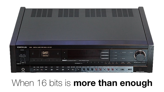 I remember the exact time I when I realised that, well used, 16 bits is more than enough for a decent dynamic range. It was 1987, and I had just taken delivery of one of the world’s first DAT machines - the AIWA EXCELIA. This extraordinary well engineered tape deck came with a demo tape - a big band album, on (I think) the DMP label, which was one of the first to embrace all digital recording.
