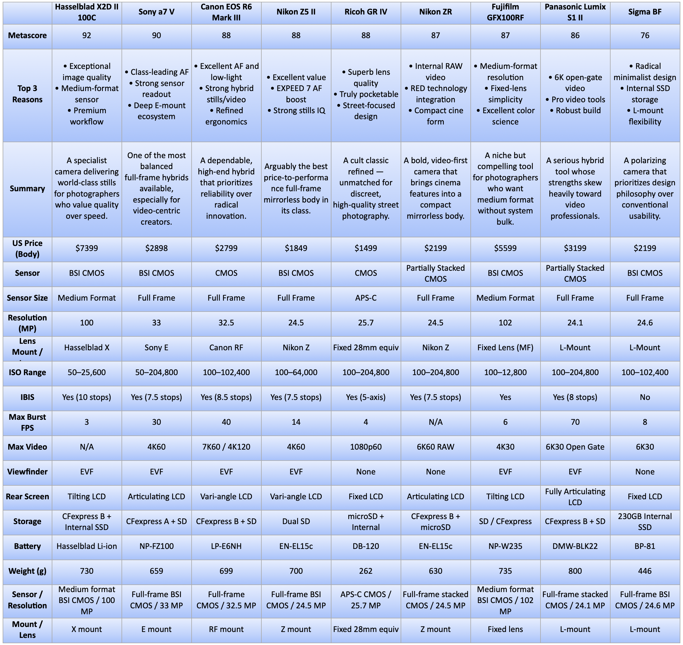 The comparison table below combines manufacturer-verified specs with an aggregated editorial assessment. Only core, comparable specifications were included to ensure meaningful side-by-side analysis. The cameras chosen were an aggregate of all the year end lists that are now appearing.