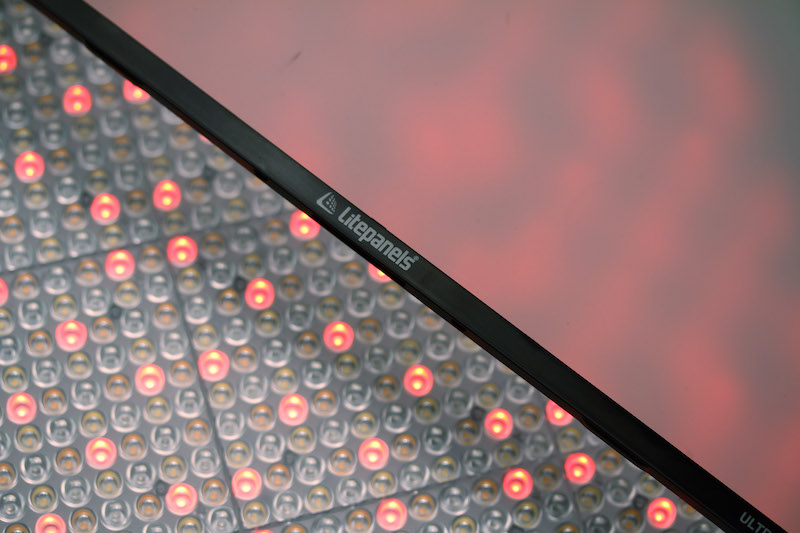 Red, green and blue emitters are scattered among the white; here, we see a red gel selected and get an idea of the density of the supplied frost filter.