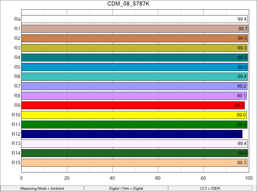 Since the average (hence the “a” in Ra) only includes fairly unsaturated test patches, there's far more information in this complete graph than a single number, going so far as to make it clear which colours risk causing problems and to what degree. It's notoriously possible for light sources to score high on CRI while still harbouring serious problems and this may go some way toward ameliorating that issue.