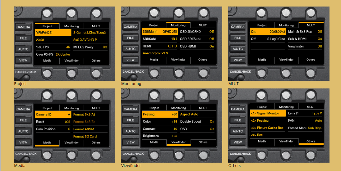 Pressing the Option button on the camera invokes Quick Menu in the sub display. This is divided into six possible sets of operations (see the visual below): Project, Monitoring, MLUT, Media, Viewfinder and Others. Press the appropriate button to select the operation set.