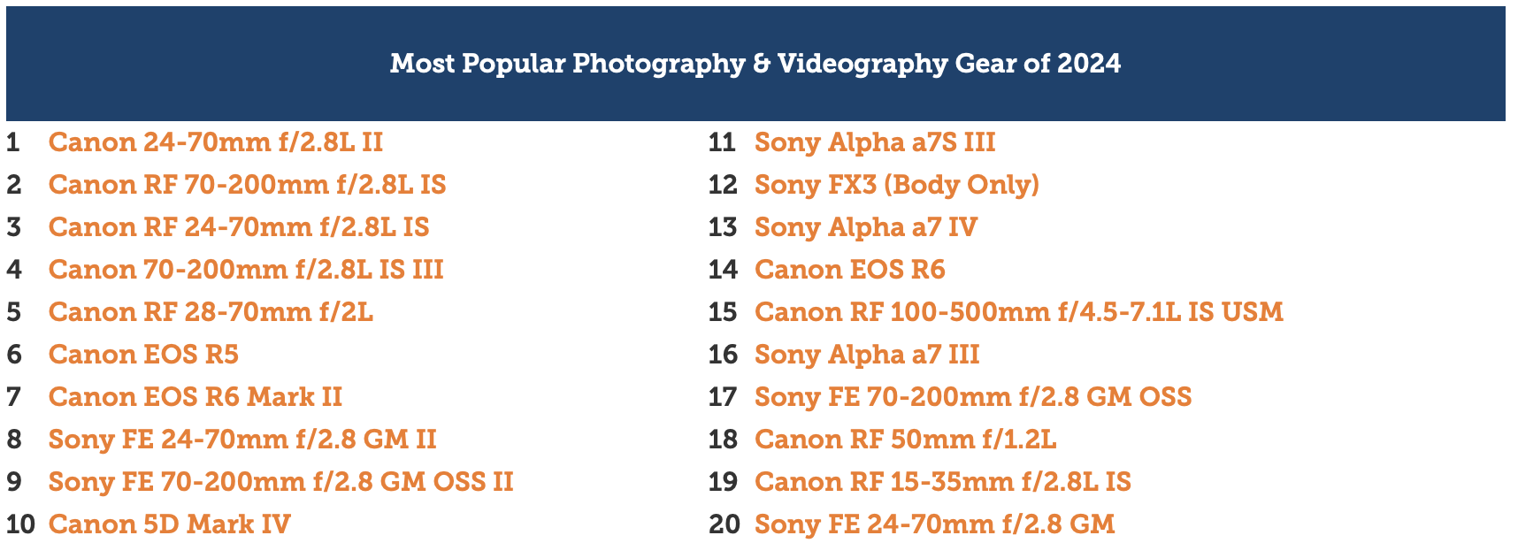 Canon's 14 entries are an impressive feat. Sony, meanwhile, has 4, and Nikon has 2, with nothing in the Top 10. If you ever shuffle through Lensrentals' yearly data you will occasionally find more nuance there as new models from other manufacturers break though. But diversity is still in fairly short supply. The combined photography and videography gear chart for 2024 is a complete Canon and Sony lock-out.