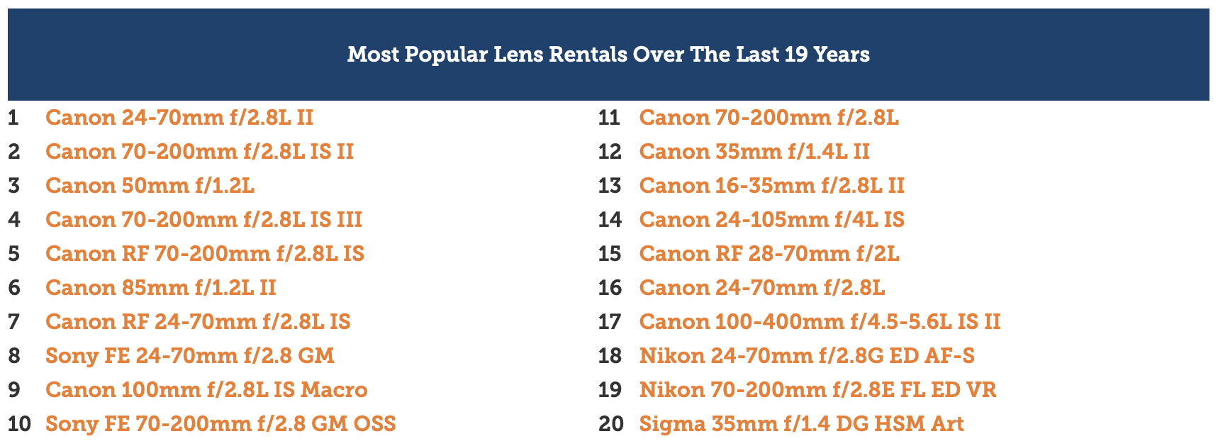 Given the company name, it's well worth looking at lens rentals over the past 19 years too. Again, there's not much diversity here, though it is worth noting the dominance of the 24-70mm and 70-200mm focal lengths in the list.