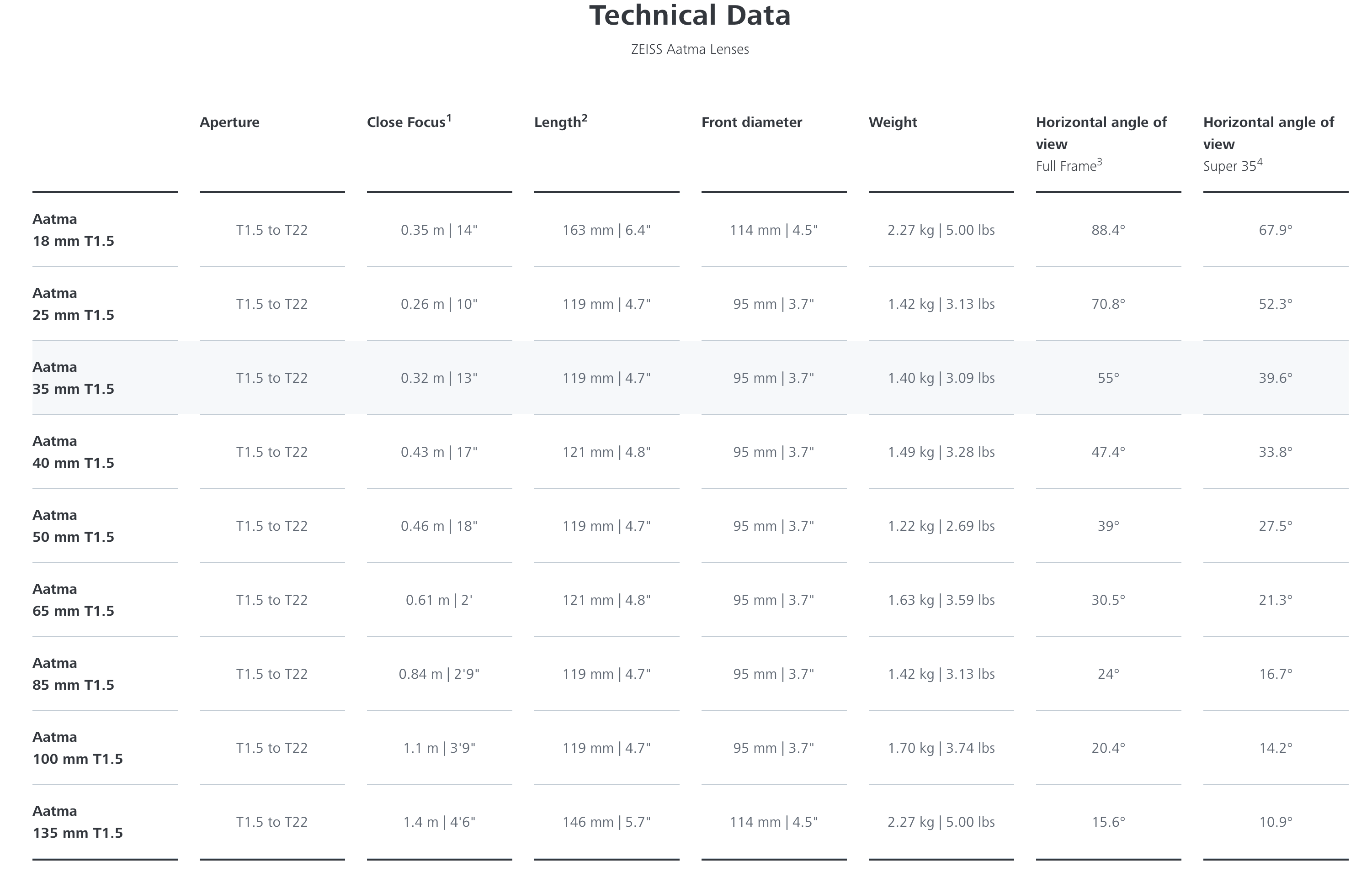 Nine lenses are available: 18mm, 25mm, 35mm, 40mm, 50mm, 65mm, 85mm, 100mm, and 135mm. All are T1.5. As you would expect, the Aatma lenses also feature consistent positions for iris and focus along with standardized front diameters of 95 mm (25, 35, 40, 50, 65, 85, 100) and 114 mm (18, 135). Weight scales from 1.22 kg (2.69 lb) to 2.27 kg (5.00 lb).